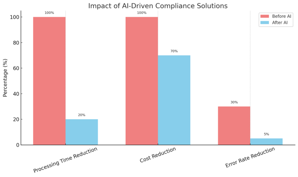 Implementing AI-driven compliance solutions has demonstrated significant benefits across various organizations. For instance, AI technologies have been shown to reduce compliance processing times by up to 80%, enabling tasks that previously took days to be completed in minutes. Additionally, companies adopting AI for compliance have reported cost reductions of approximately 30% due to decreased manual efforts and increased efficiency [9]. Moreover, the integration of AI has led to a substantial decrease in error rates, with some organizations experiencing a drop from around 30% to below 5%, enhancing the accuracy of compliance processes. These improvements not only streamline operations but also mitigate risks associated with non-compliance, highlighting the significant return on investment when leveraging AI technologies in compliance frameworks [10].