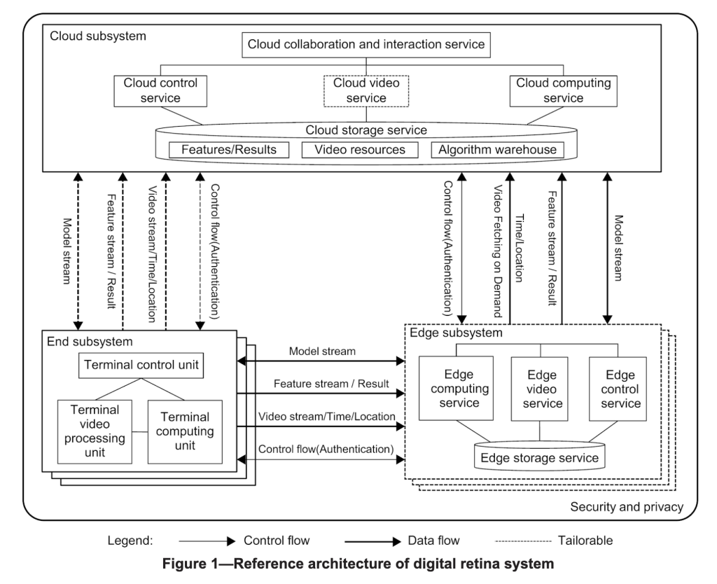 IEEE Std 3161-2022 outlines a reference architecture, technical characteristics, components, and functional requirements for digital retina systems. The end-edge-cloud collaboration and multi-stream cooperation mechanisms are established, ensuring efficient interaction across all levels. Specifically, technical characteristics of digital retina systems are specified, including globally unified time-space ID, efficient video coding, compact feature representation, model-updatability, software-definability, attention-adjustability, etc. On this foundation, end subsystem is defined as a subsystem mainly used for the perception of scenario information, with such functions as data acquisition, processing, analysis, and transmission. Edge subsystem is defined as a subsystem using edge computing and providing functionalities of multi-channel data aggregation and forwarding, cooperative resource scheduling, and data computing. Cloud subsystem is defined as a subsystem using cloud computing and providing functionalities of system management and collaborative interaction, data aggregation and storage, data collaborative analysis, mining, and decision-making at the global level.